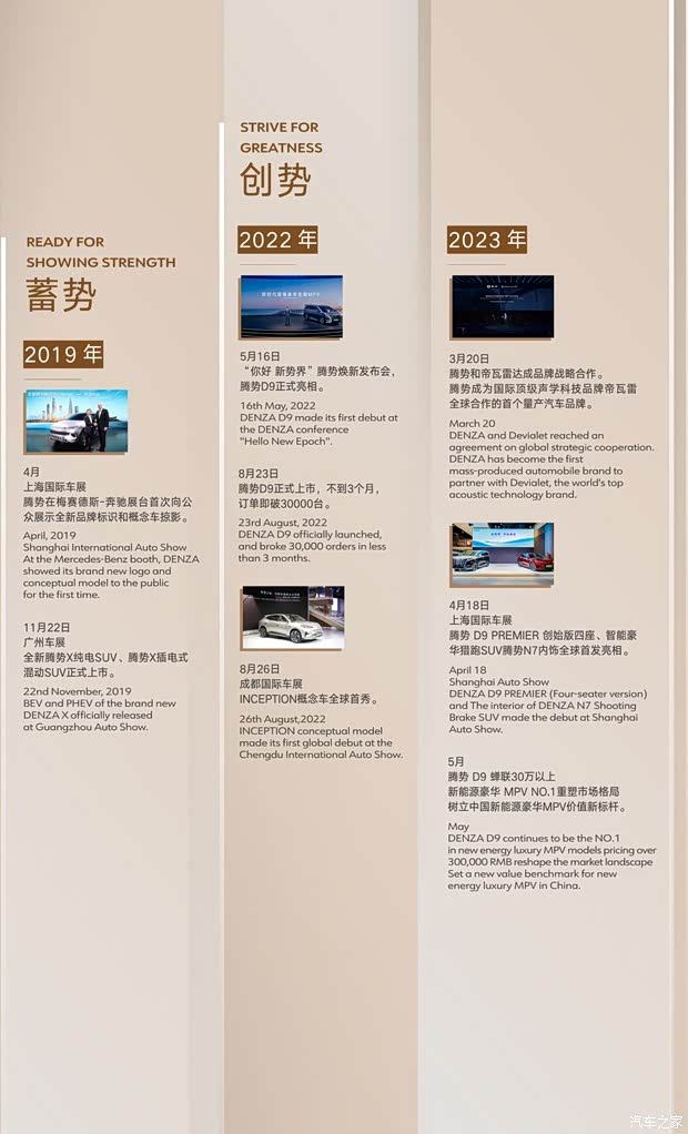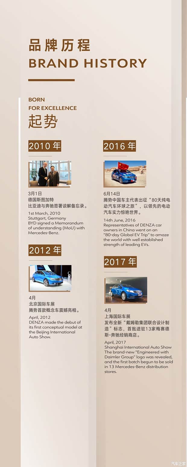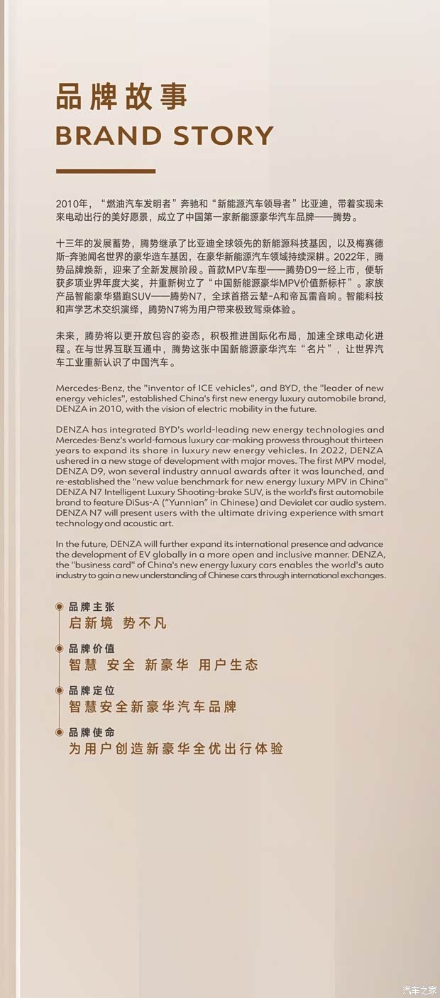 腾势品牌源于实现未来电动出行的美好愿景 比亚迪与梅赛德斯-奔驰携手 打造了中国首个致力于新能源的汽车合资品牌 从先知到先行,腾势生而不凡 腾势将实力与信心,不断注入产品与行动 汇聚比亚迪与梅赛德斯-奔驰优势 沉淀打磨,蓄万钧之势,一触即发 品牌势能与时代的洪流交汇 腾势迎来释放强大势能的时机 将开启新能源智能汽车的非凡新境!