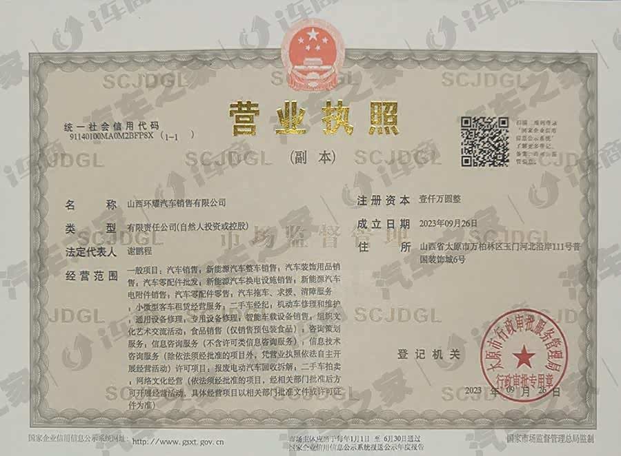 山西环耀汽车销售有限公司成立于2023年,于2024年4月正式营业,是环耀集团山西首家通过比亚迪汽车授权的海洋网。位于太原市万柏林区玉门河北沿岸普国装饰城旁,营业面积5000方米,是根据比亚迪全国统一标准并结合海洋系列的装修特色,运动且时尚化装饰风格。 目前公司内设有销售部、市场部、售后服务部、备件部、行政部,各部门人员配备完整,员工总数20余人。负责销售的车型包含海鸥、海豚、海豹、宋plus、驱逐舰05、护卫舰07等车型。
