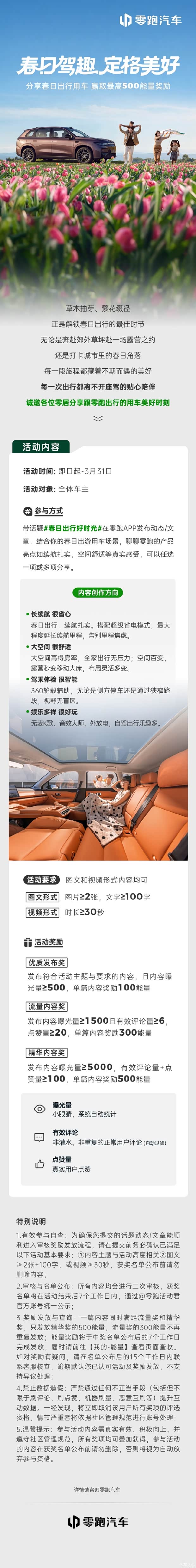 春和景明,正是放风好时候! 和零跑一起,去没有天花板的地方尽情野🚗 即日起-3月31日,带话题#春日出行好时光# 在零跑APP分享你的用车美好时刻,赢取能量奖励✨ 戳图了解更多活动详情,等你晒出春日出行好时光!