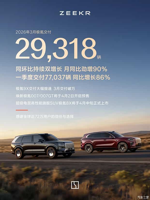 极氪3月交付量出炉:新车交付29,318辆,同比劲增90%、环比增长23%;
