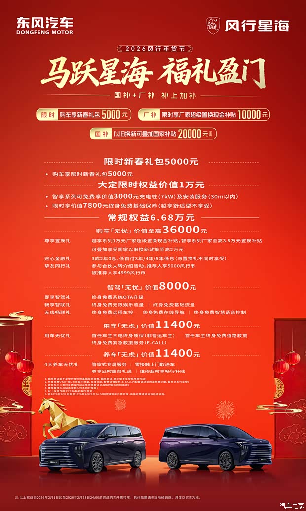 马年新春佳节来临之际,东风风行特为星海V9购车用户推出多重好礼。即日起,购车可享5000元新春礼包和限时享厂家超级置换现金补贴1万元等,并且以旧换新可叠加国家补贴2万元,国补+厂补的丰富权益,真心实意助力新春购车用户,用更轻松的入手价格,解锁远超同级的出行新体验。
