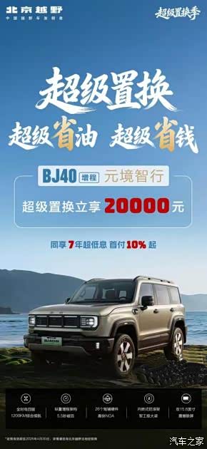 近日,为了回馈广大消费者,北京越野开启超级置换季活动。该活动分为两部分,第一部分以“超级置换+超级省油+超级省钱”的组合拳,针对BJ30旅行家混动版、BJ40增程元境智行两款车型,推出了极具竞争力的置换政策;第二部分则为BJ40增程赤兔版和BJ40探险家推出了专属优惠福利,让更多新老车主感受到了品牌的十足诚意。此次活动时间3月24日至4月30日。
