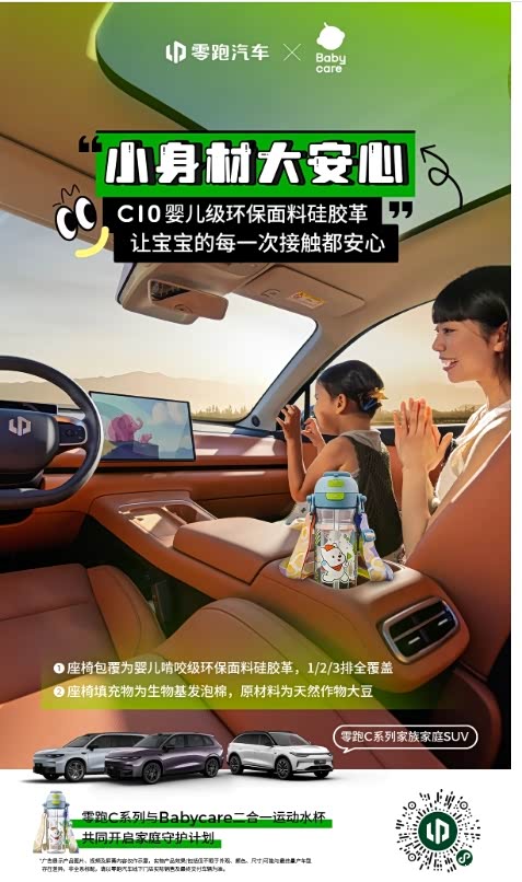 宝宝探索世界的第一步, 是从摸摸座椅、咬咬扶手开始的 👶 零跑C系列,用婴儿级环保面料打造移动安全屋 座舱用料工艺双环保,烈日暴晒后车内空气依旧清新 81.9%高强度笼式车身,守护全家出行每一程 #零跑汽车 与@Babycare 共同开启家庭守护计划 装下童年,carry安心,让爱与安全一路随行