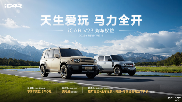 新春的购车热情还未散去,iCAR品牌又为消费者送上新一轮诚意福利。2026年3月1日至31日,iCAR V27与iCAR超级V23双车同步推出升级版客户权益,从到店试驾到购车交付,从金融方案到长期保障,全方位降低拥车门槛,让每一位心怀热爱的用户都能轻松开启高品质的纯电出行生活。
