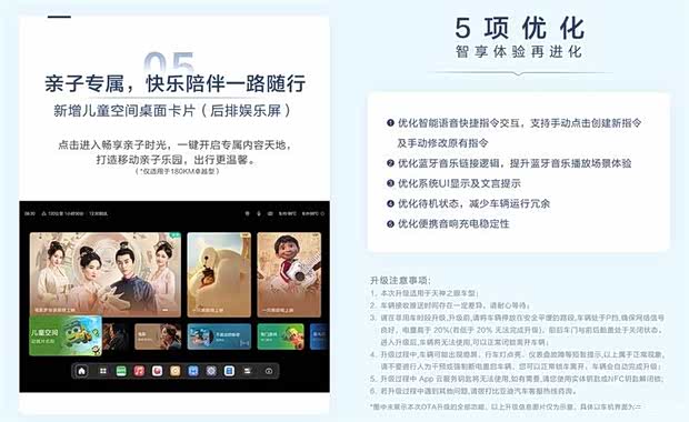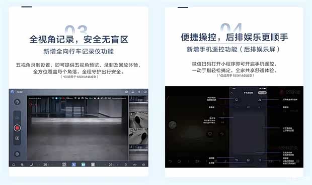 在高端配置的180KM卓越型上,此次OTA带来了更具实用性的功能迭代,其中新增的全新全向行车记录仪功能,支持五视角录制与回放,实现了车身周边无死角覆盖,既提升了行车安全性,也为意外情况提供更全面的取证支持。此外,后排娱乐屏也新增了两项重要功能,其中一项是通过小程序即可实现的手机遥控功能,让后排操作更为便捷;另一项功能则是在儿童空间桌面卡片中加入亲子出行场景,一键进入儿童专属内容界面,打造出真正意义上的移动亲子座舱。