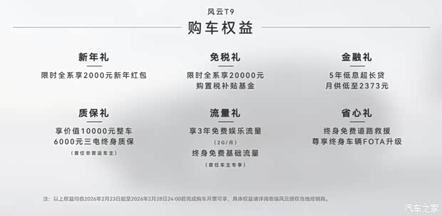 除了核心的产品力,风云T9的用车保障也让消费者“买得放心,用得安心”。首任非营运车主可享受价值10000元整车+6000元三电终身质保,彻底解决新能源车型的后期质保顾虑;还能享受终身免费道路救援、终身车辆FOTA升级;3年免费娱乐流量(2G/月)+终身免费基础流量,后期用车几乎无额外成本。风云T9的终身质保政策,不仅体现了品牌对产品品质的自信,更让消费者的长期用车有了兜底保障。