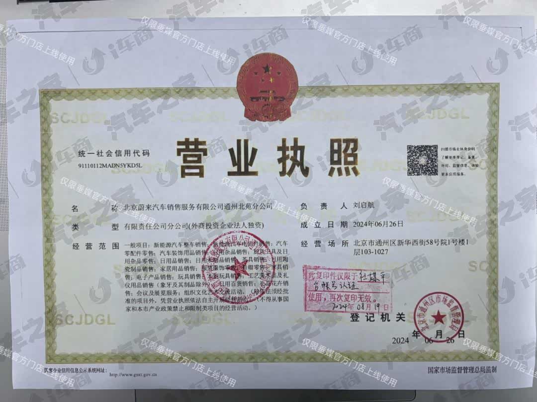 北京蔚来汽车销售服务有限公司通州北苑分公司