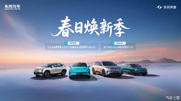 东风奕派特别推出"春日焕新季"限时购车福利,4月9日至4月20日期间购车的用户,可在厂家置换补贴、国家补贴等各项福利之上,额外参与购车抽奖活动,至高可获价值6899元的华为大奖,至低可中2000元购车券,100%中奖,大奖抽不停。