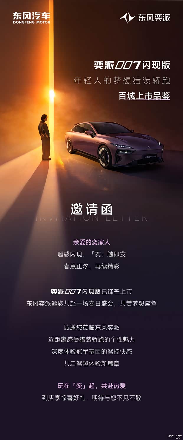 年轻人的梦想猎装轿跑奕派007闪现版现车已在全国百城同步到店。超感闪现,「奕」触即发。东风奕派诚邀您即刻到店品鉴试驾,官改品质、街赛双模,近距离感受猎装顶翼、光影流溯后保等越级配置,零距离体验驾乘质感,先试后买,购车更安心。亲身体验开"新"实力。趁春日好时光,想省钱就现在!