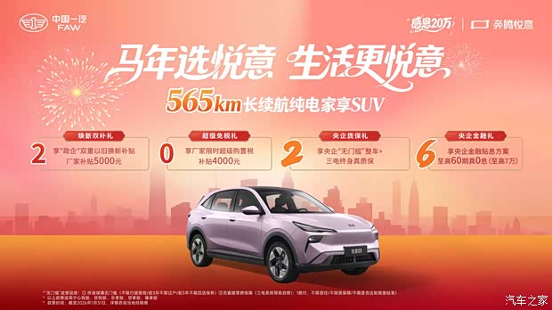 马年选悦意,生活更悦意!新春将至,正是陪伴家人、共度美好时光的时节。一辆空间宽敞、续航扎实、品质出众的纯电SUV,将让春节出行更从容、更惬意。奔腾悦意03将以更好的用车体验及更强的央企保障,陪伴更多家庭开启新春悦意生活。
