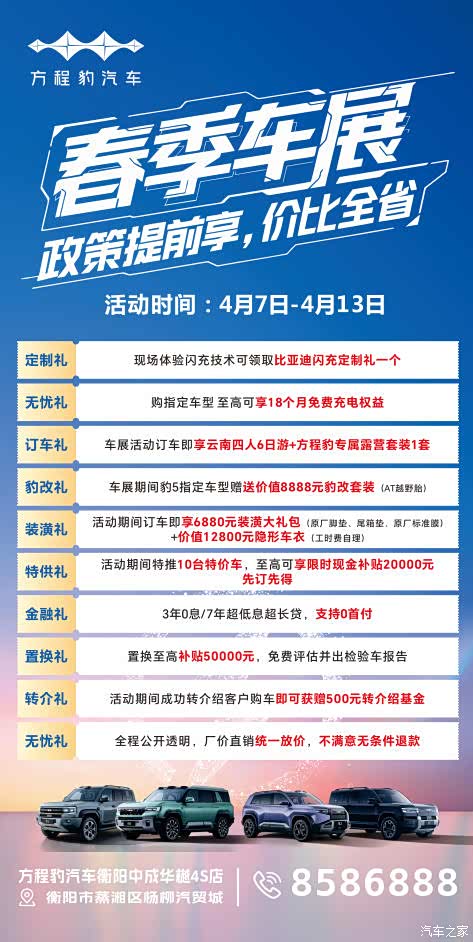 春日焕新,购车正当时!方程豹汽车衡阳中华华樾4S店盛大开启「春季车展」,活动时间4月7日-4月13日,以厂价直销的诚意、十重豪礼的惊喜,为衡阳及全省消费者带来一场不可错过的购车盛宴,真正实现政策提前享,价比全省!