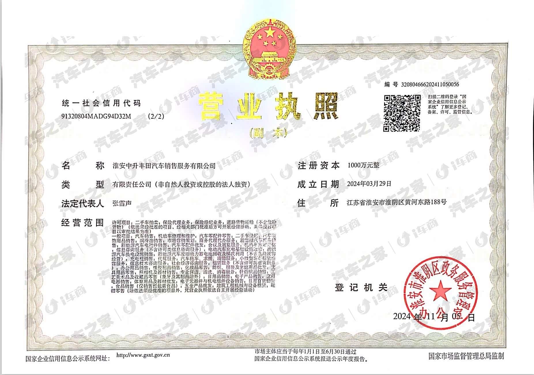 经营范围:作为丰田汽车(中国)投资有限公司丰田(TOYOTA)进口汽车和一汽丰田汽车销售有限公司丰田、达路汽车的品牌经销商,从事上述品牌汽车的销售(不含批发);车辆展示、维修保养、零配件供应;汽车用品的批发与零售;从事二手车经销业务;经济信息咨询;代办汽车手续。