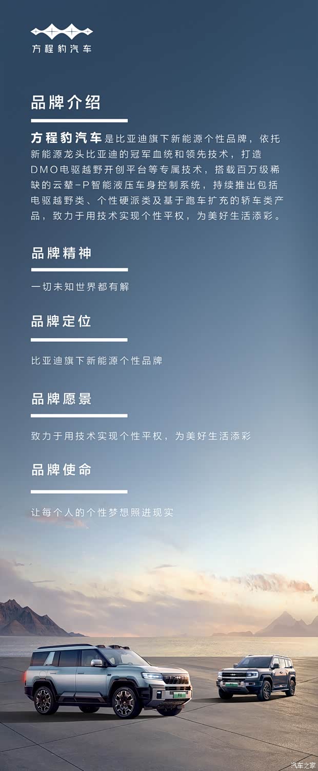方程豹汽车是比亚迪集团旗下的全球首个新能源汽车专业个性化品牌,是比亚迪基于行业开拓者、领导者的智慧,以及对消费趋势的深度洞察而进行的对“汽车新业态、产品新形态,用户新体验、用车新生活”的一次先锋探索,与用户共同开启汽车电动化、智能化之上全新的个性化变革。方程豹依托DMO超级混动越野平台等专业、全面、强悍的“豹力科技”,并由技术延伸打造方程豹专属的“豹力美学”,构建方程豹汽车产品的独特“豹力”特征,持续探索更多样的汽车产品形态和可能性,彻底实现个性平权,让每个人都能感受电带来的极致自由。