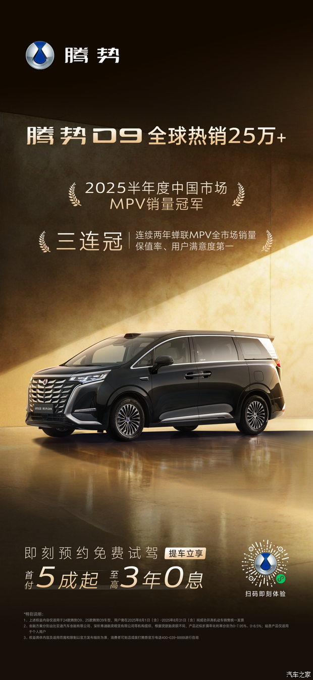 腾势D9全球热销25万,提车立享至高3年0息贷