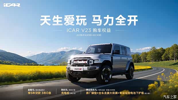 作为入门级硬派 SUV 的优选,iCAR V23 凭借潮酷造型与灵活实用的空间,精准击中年轻家庭的出行需求。4 月购车,用户到店试驾即可获赠精美小车模,沉浸式感受车型魅力;金融方案上,可享 5 年长贷、3 年免息的轻松购车政策,更有 3000 元 / 台专属金融补贴,大幅降低购车门槛。全系购车用户可免费获赠充电桩及安装服务,同时限时赠送价值 2999 元原厂脚垫、全车龙膜与锰钢电池下护板,从购车到用车一步到位。赛博版车型更有专属车顶行李平台、射灯及原厂贴纸,打造专属个性风格。此外,车型还为用户提供终身免费 APP 车控功能、每月 10G 终身娱乐流量,首任非营运车主更可享整车 + 三电终身质保、终身免费道路救援,官方认证二手车同样享受终身质保保障,让每一次出行都安心无忧,商家也可结合实销支持,为用户定制灵活的专属促销方案。(详情到店了解)