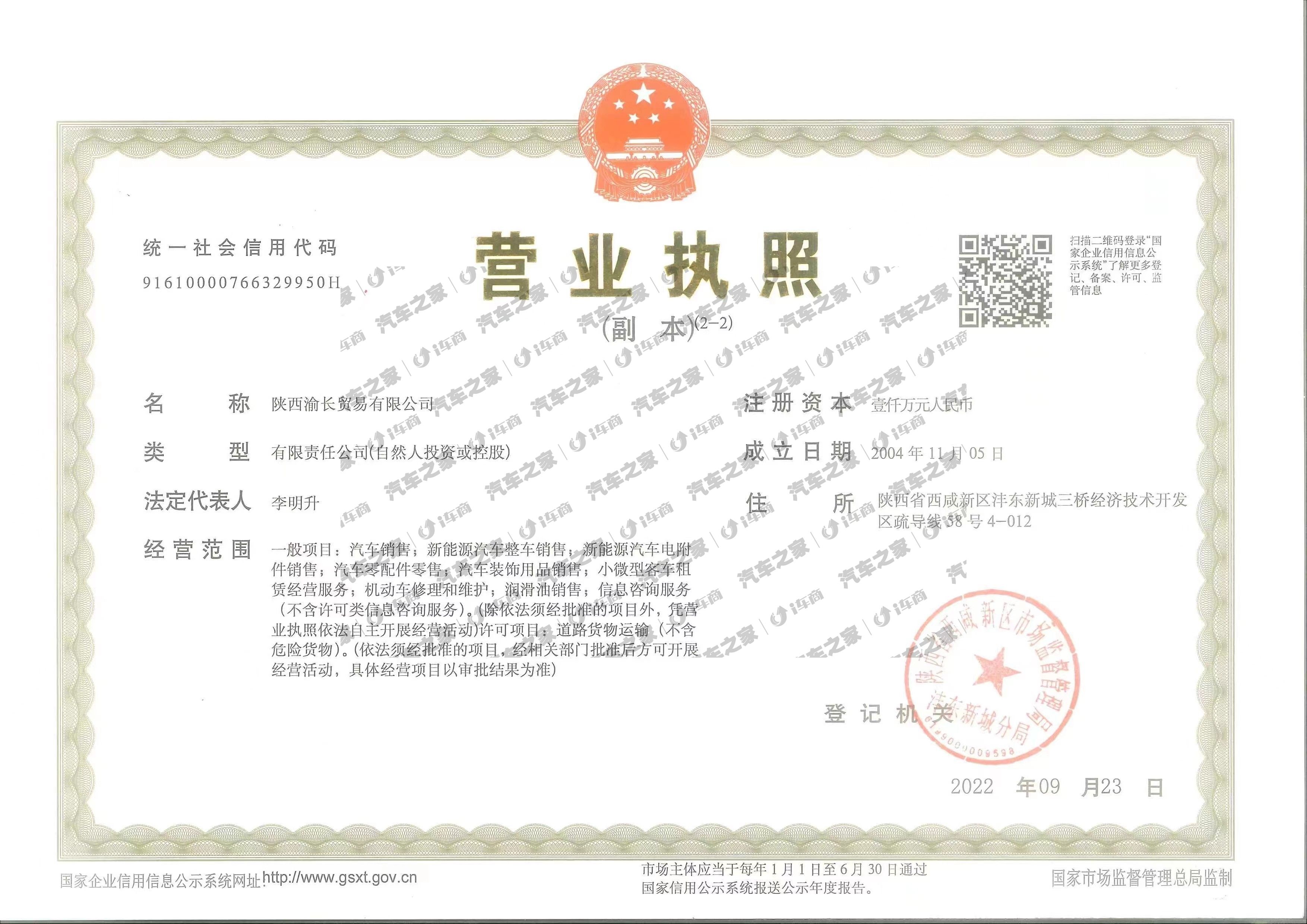 陕西渝长贸易有限公司成立于2004年11月05日,注册地位于陕西省西咸新区沣东新城三桥经济技术开发区疏导线58号4-012;经营范围包括一般项目:汽车销售;新能源汽车整车销售;新能源汽车电附件销售;汽车零配件零售;汽车装饰用品销售;小微型客车租赁经营服务;机动车修理和维护;润滑油销售;信息咨询服务(不含许可类信息咨询服务);