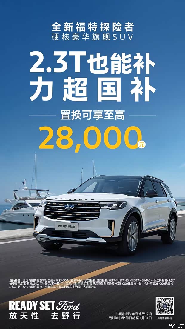 2026年国家汽车消费补贴政策正式落地,燃油车型补贴范围被限定在2.0T及以下排量,这让不少青睐强劲动力的消费者犯了难。但福特品牌迅速响应市场关切,为搭载2.3T EcoBoost®发动机的全新福特探险者推出了至高20000元的限时置换补贴,实现了“2.3T也能补”的市场破局之举。在此基础上,结合部分地区2.0L排量以内最高13000元的置换补贴政策,福特探险者的综合置换补贴至高可达28000元,为追求性能的消费者省下真金白银。