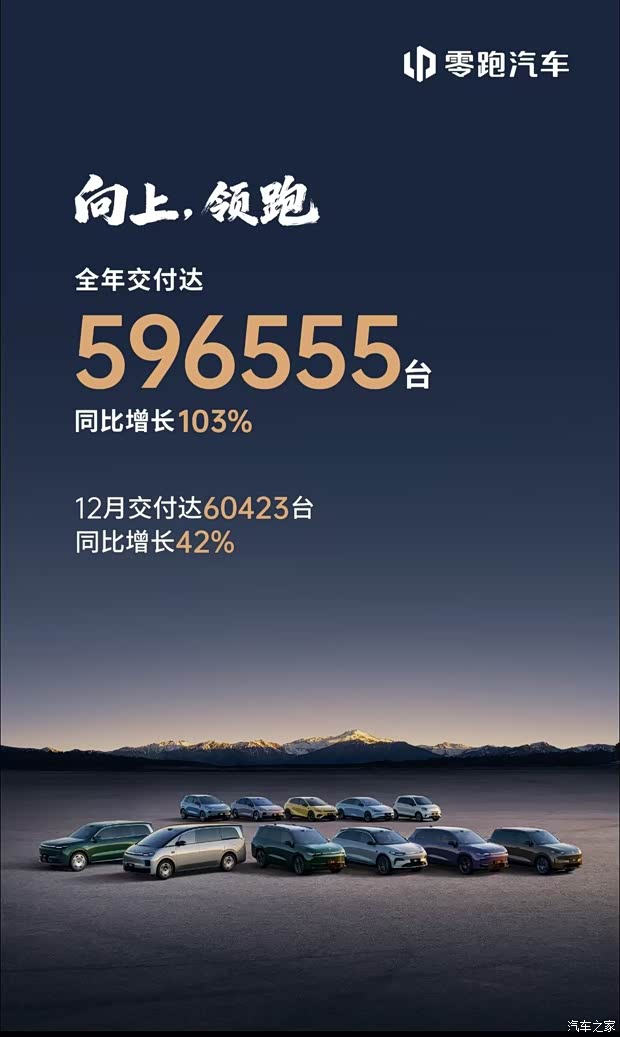 2025年,零跑全年累计交付达596555台,同比增长103% 零跑汽车12月全系交付达60423台,同比增长42% 2026年,我们将坚持全域自研,向“世界ji智能电动车企”目标前进 #零跑汽车 #零跑的卓越10刻 #新能源汽车 #好车推荐 #汽车销量