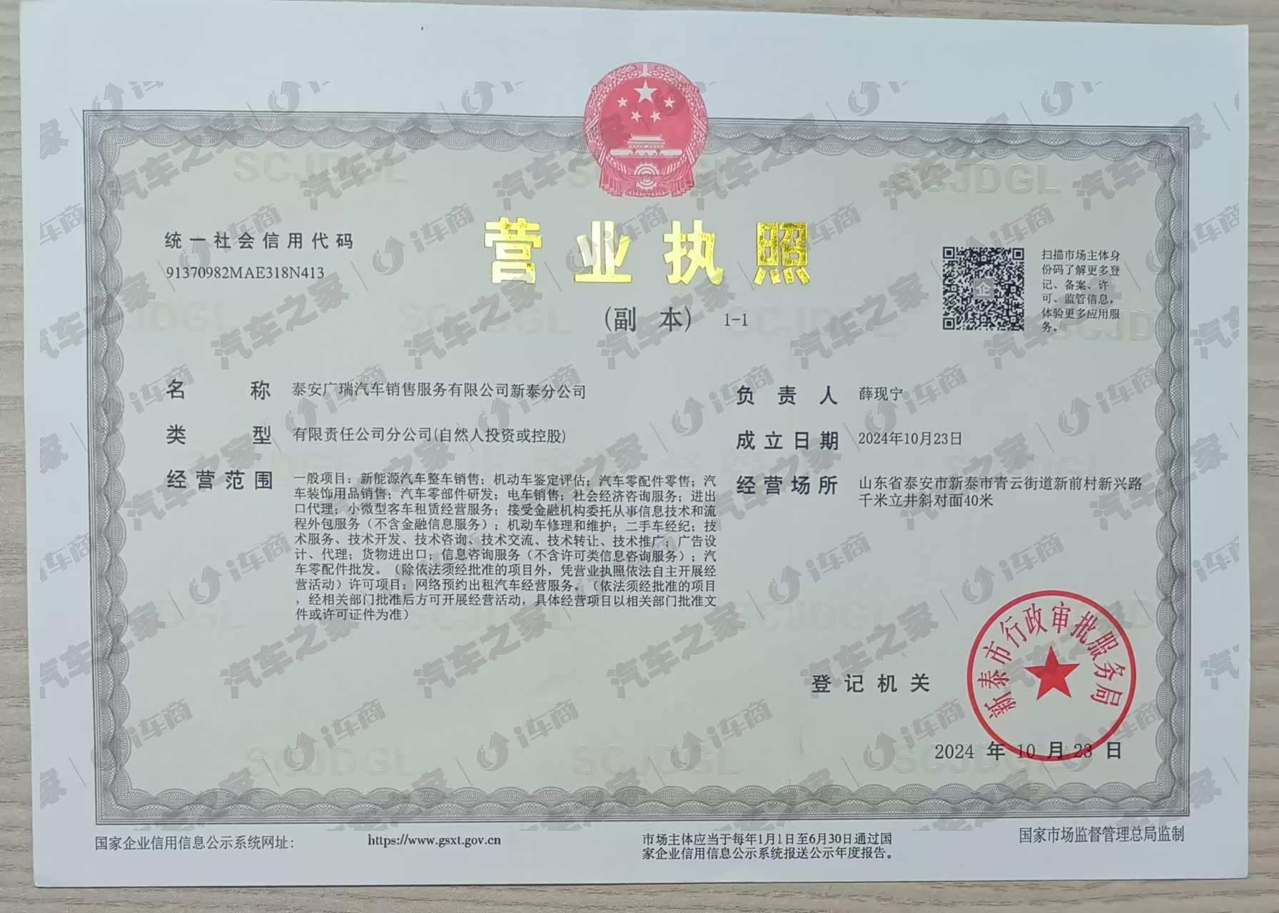 泰安广瑞汽车销售服务有限公司新泰分公司
