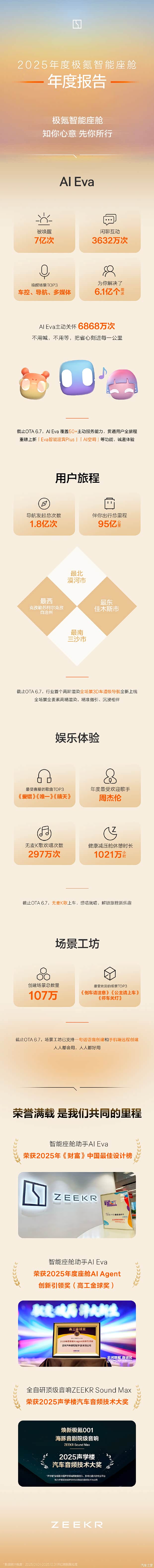 #极氪智能座舱#2025年度报告暖心上线 这一年,AI Eva把贴心藏进每一公里,陪你踏遍南北,把座舱变成有歌有乐的小天地。 我们一起共创专属场景,还拿下了不少认可与荣誉。 每一段同行的时光,都是你和极氪座舱的记忆。 你的年度座舱小故事是什么?欢迎评论区聊聊~ #极氪#