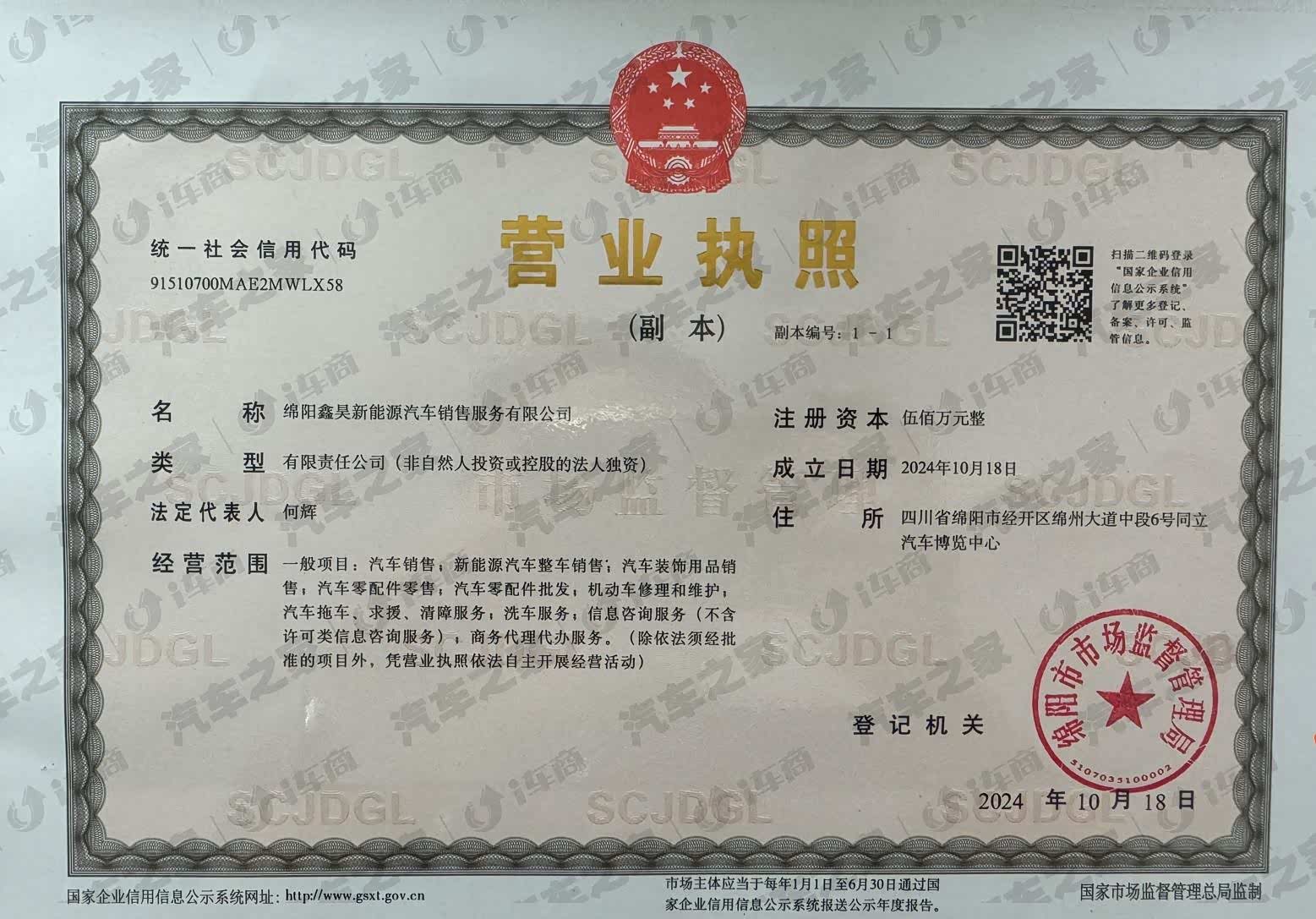 绵阳鑫昊新能源汽车销售服务有限公司成立于2024-10-18,主营方程豹——比亚迪旗下个性品牌,集整车销售、售后服务为一体的厂家授权4S店。4S店地址在绵阳市经开区绵州大道中段6号同立汽车城文武路。