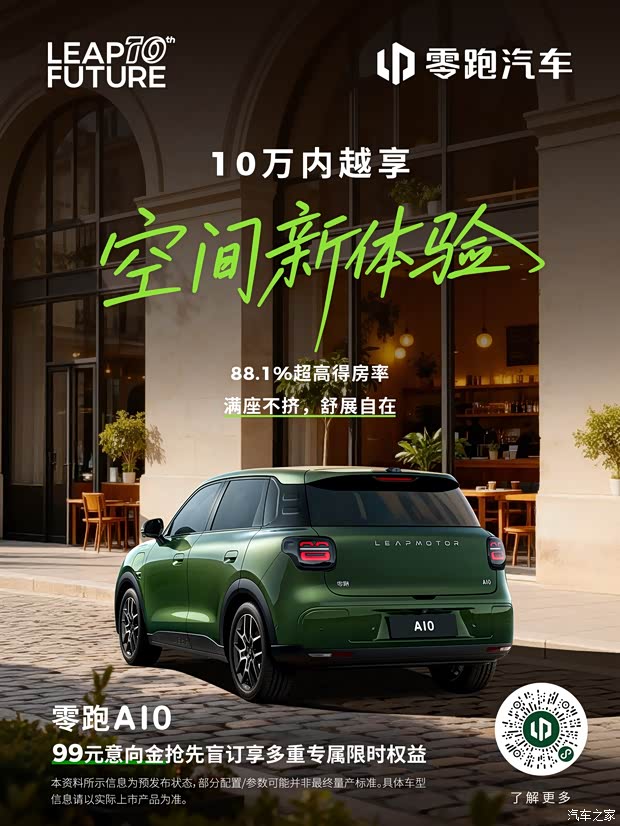 #零跑A10 究竟能有多“全能”? 续航真从容:500km长续航+快速补能,畅行无忧! 精智真高阶:激光雷达+8650芯片,驾驭新体验! 空间真敞阔:88.1%得房率,满座亦舒展! 盲订进行时,99元即可锁定限时权益