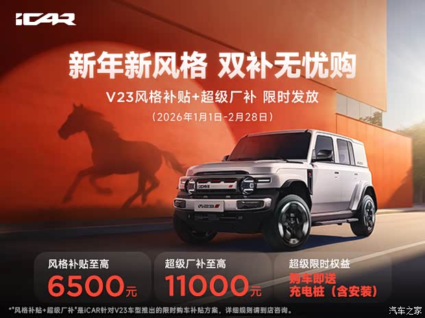 这一卓越的市场成绩,不仅是产品力最直接的证明,更标志着V23已成为该品类消费者公认的价值标杆。与此同时,为回馈广大用户的支持,并让更多消费者无负担地享受冠军车型的出行乐趣,iCAR品牌在新年伊始同步推出诚意满满的“开年双补”礼遇。这不仅是对冠军实力的再次加码,更体现了iCAR“价值平权”的一贯主张。