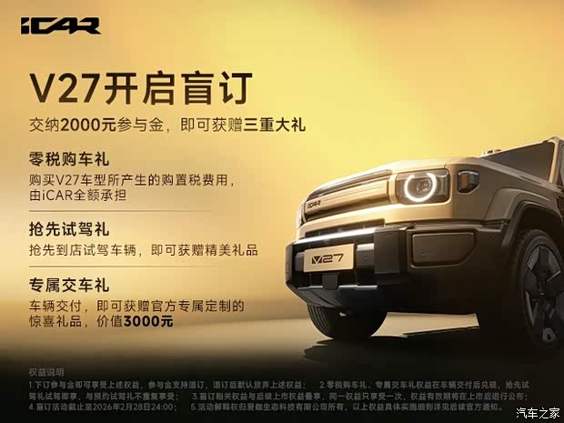 这既是一份实实在在的购车优惠,更是一份加入V27全球首发阵营的邀请函。您不仅是车主,更是iCAR特色车战略迈向全球的见证者与共创伙伴。