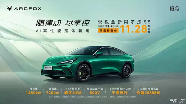 极狐全新阿尔法S5预售开启 预售补贴价11.28万元起! AI高性能宽体轿跑 随律动尽掌握