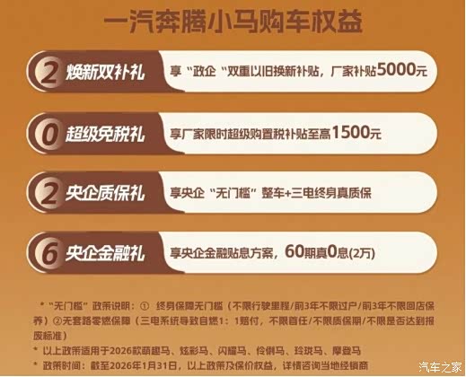 2026年1月16日,一汽奔腾小马正式推出全新车型——摩登马。同时为迎接马年并庆祝20万辆下线里程碑,一汽奔腾小马同步启动“马年开小马 快乐再加码”新年购车活动。针对主要款型,推出涵盖焕新双补礼、超级免税礼、央企质保礼、央企金融礼。其中,真质保尤为亮眼——提供无门槛的整车及三电系统终身质保,且前三年不限过户、不限回店保养。更有置换5000元+购置税1500元+60期2万免息三大核心优惠。