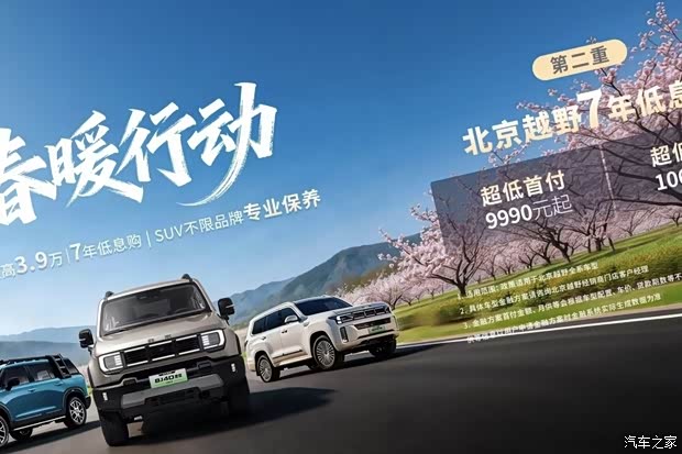 春风拂野,万物焕新。正值春日出行黄金季,北京越野重磅启动春暖行动,推出三重礼遇:国厂补双享至高3.9万、7年低息购、SUV不限品牌专业保养三折,涵盖BJ30旅行家、BJ40增程、BJ40燃油和BJ40探险家等多款车型,用实打实的福利优惠和全方位的服务保障,让更多消费者轻松拥抱美好出行生活。