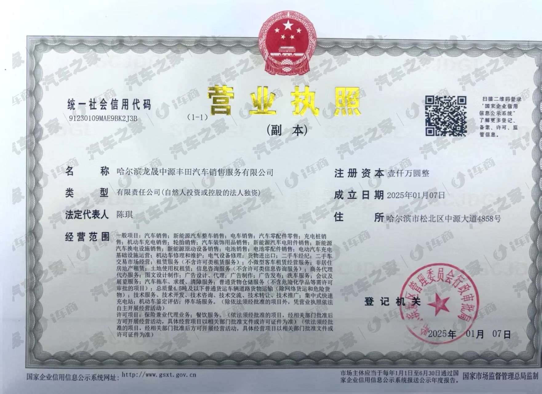 哈尔滨龙晟中源丰田汽车销售服务有限公司