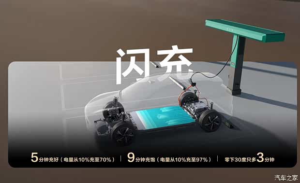 快充技术,车辆补能效率表现优秀。5分钟电量10%-70%,9分钟电量到97%,零下30℃