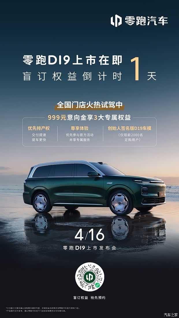 #零跑D19 距离上市还有1天! 实车已陆续到店,欢迎预约试驾! 更多精彩,明晚19:00上市发布会,不见不散! 现999元意向金可享多重权益 ✅ 优先排产,加速交付 ✅ 优先参与官方活动并尊享专属服务 ✅ 创始人签名版D19车模(前2000名确认为定购用户)