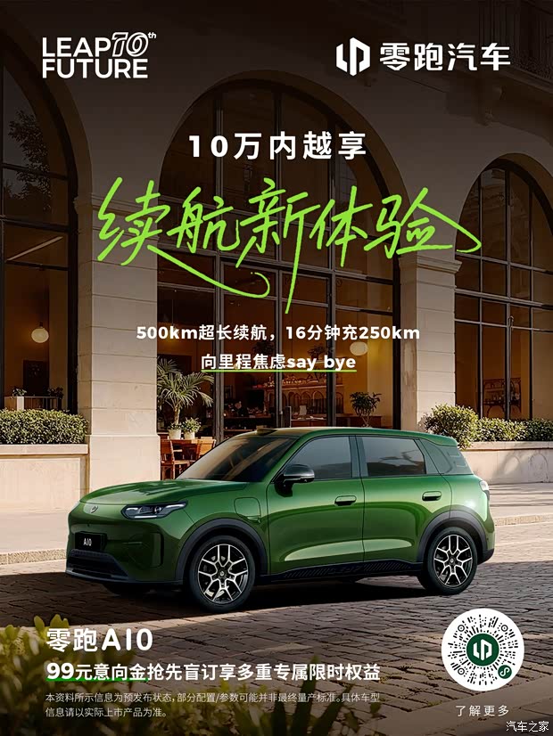 #零跑A10 究竟能有多“全能”? 续航真从容:500km长续航+快速补能,畅行无忧! 精智真高阶:激光雷达+8650芯片,驾驭新体验! 空间真敞阔:88.1%得房率,满座亦舒展! 盲订进行时,99元即可锁定限时权益