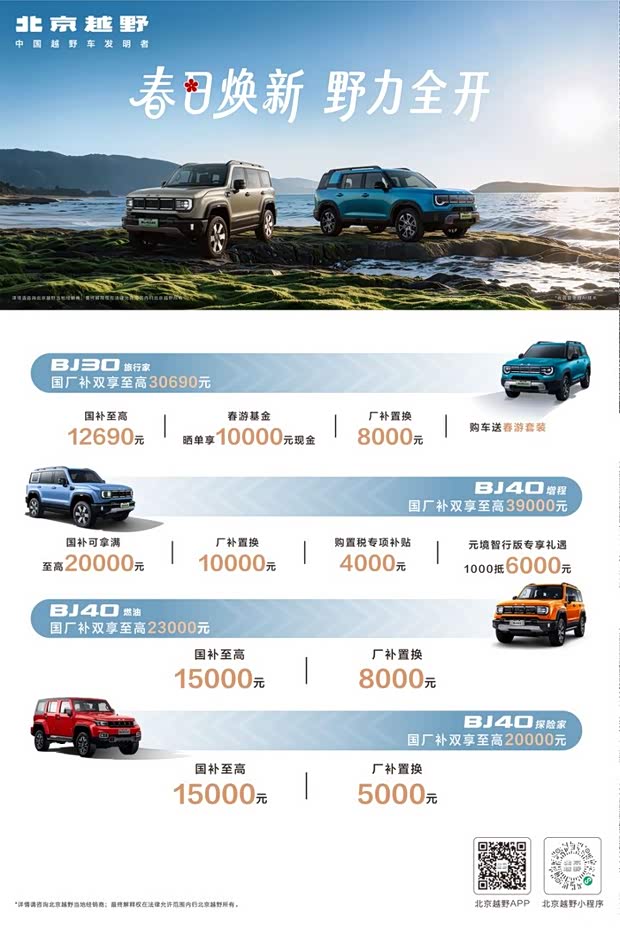 春风渐暖,山野与海岸都在召唤自由的灵魂。北京越野全家族携春日焕新重磅福利而来,从BJ30到BJ40燃油、增程、探险家,每一款都为你量身定制购车方案,让你以更轻松的姿态,解锁每一场春日野趣。