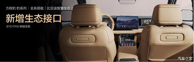 豹5长续航版、豹8大五座版上市即搭载钛7同款比ya迪智慧生态,通过生态设备的“全能管家”比ya迪智慧物联APP,无需复杂操作,也不需要手动连接多个设备,语音指令即能控制全车所有的生态产品。此外,两款新车型的前排座椅背后均加装了生态接口,插入转轴支架后,可以搭配BYD Pad使用。未来将有更多的生态产品,通过生态接口提供用户以智慧互联的无限体验。