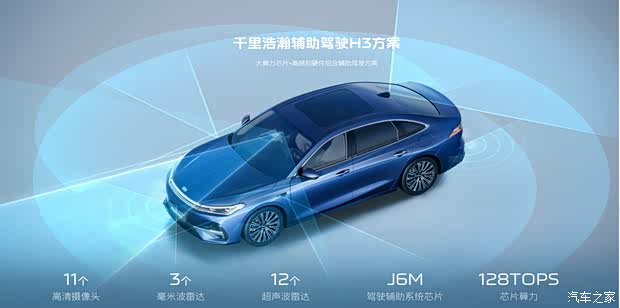 吉利银河A7搭载千里浩瀚智能辅助驾驶系统,采用大算力芯片和高感知硬件组合的方案