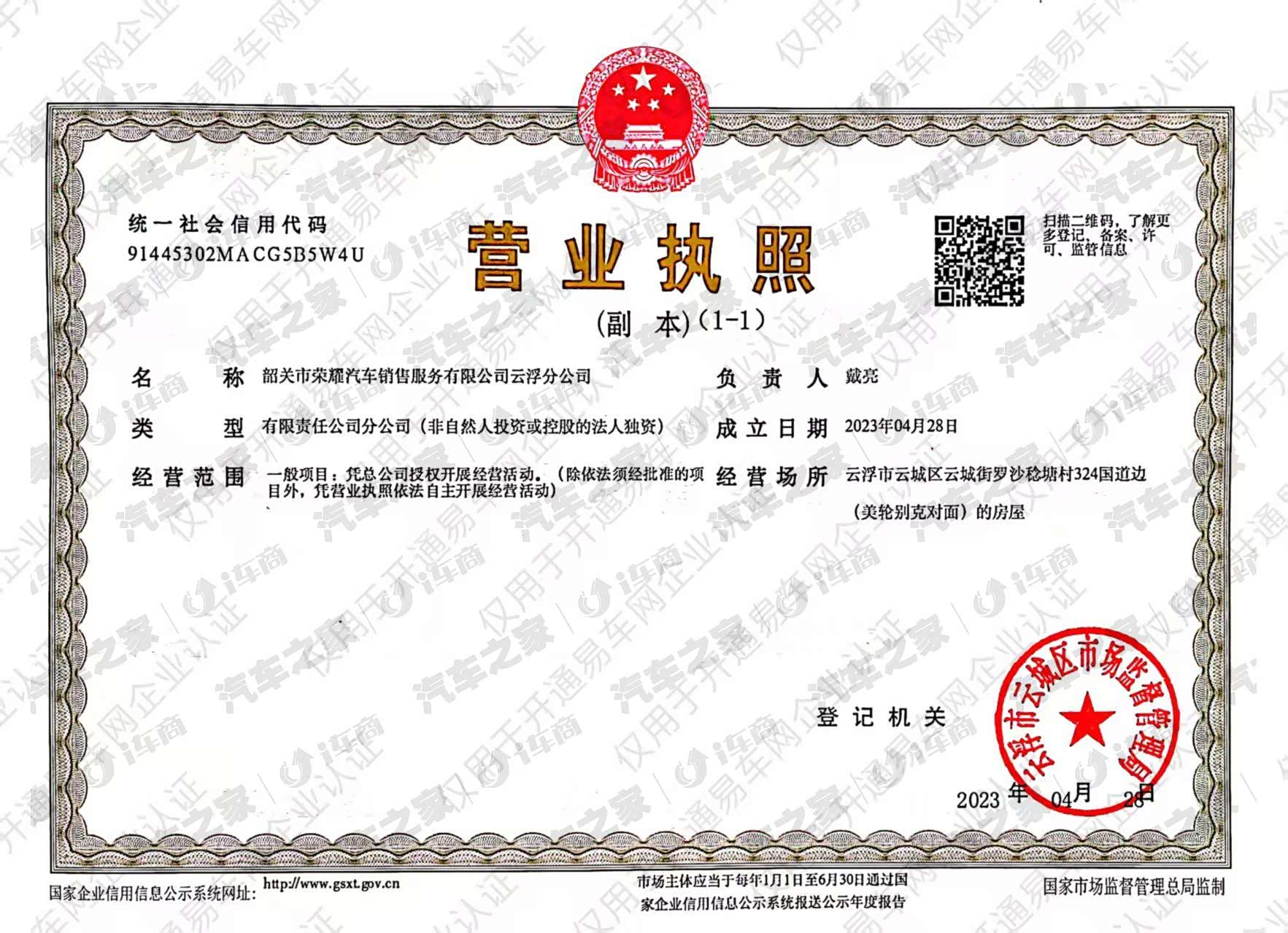 云浮荣耀红旗体验中心隶属于韶关荣耀汽车。于2023年成立通过一汽红旗汽车在云浮地区唯一认证经销店,集厂家新车销售、二手车置换、金融按揭、原厂配件、售后维修服务于一体的红旗销售服务有限公司。地址位于广东省云浮市环市东路(云石中学斜对面)。经营红旗汽车车型有:H5.HS3.HS5.H6.HS6.HS7.H9.HQ9.天工05.06.07 金葵花等红旗高端品牌