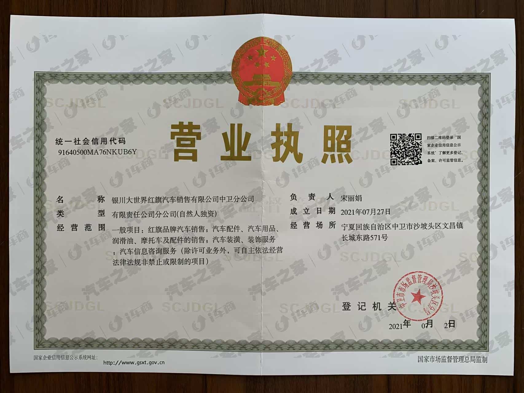 银川大世界红旗汽车销售有限公司中卫分公司是宁夏大世界集团公司旗下的一家子公司,主要经营一汽红旗品牌的H5、HS5、H9、HQ9等车型,成立于2021年,中卫红旗体验中心座落中卫市沙坡头区文昌镇长城东路571号,地理位置十分优越,是一汽红旗标准建设的体验中心,占地面650平方米,集展示、销售、售后、维修、零配件仓库为一体的,为消费者提供全方位、最优质售前、售中、售后服务,秉着“让理想飞扬”的创新精神,为顾客带来更为完美的购车体验及驾乘感受。