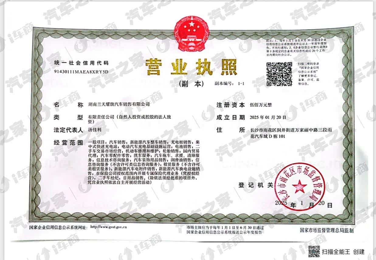 湖南兰天耀旗汽车销售有限公司成立于2025年1月20日,隶属于湖南兰天集团,坐落于长沙市雨花区兰天汽车城。公司拥有整车销售、汽车配件、汽车维修等配套服务设施,宽敞明亮的汽车展示大厅,温馨舒适的购车环境,拥有专业、朝气蓬勃的销售团队和技术精湛的售后团队,全方位为顾客提供专业细致的一条龙服务,最大化的保障客户权益,兰天集团也一直秉持着“车在兰天下,人在幸福中”的理念,致力于为客户提供最优质的产品和服务。我们的服务就是对您最好的承诺。