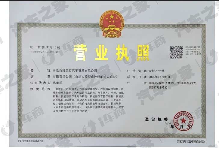 秦皇岛腾益行汽车贸易有限公司,成立日期2024年1月0日。注册地址于秦皇岛市经济技术开发区秦皇西大街287号1号楼。法定代表人为 孙董军。经营范围-般项目:汽车销售:汽车零配件批爱:汽车零配件零售:机动车修理和维护:汽车装饰用品销售:汽车拖车、求援,清障服务:新能源汽车电所件销售:新能源汽车整车销售;新汽车换电设施销售:电动汽车充电基础设施送营:二手车经纪:信息咨询服务「不含许可类信息咨询服务】:赁服务《不含许可类租赁服务)。【除依法须经批准的项日外,营业执国依法自主开展经营活动)