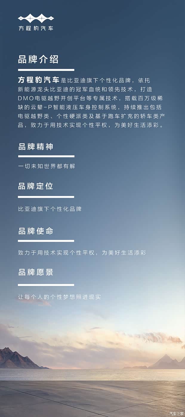 方程豹汽车是比亚迪集团旗下的全球首个新能源汽车专业个性化品牌,是比亚迪基于行业开拓者、领导者的智慧,以及对消费趋势的深度洞察而进行的对“汽车新业态、产品新形态,用户新体验、用车新生活”的一次先锋探索,与用户共同开启汽车电动化、智能化之上全新的个性化变革。