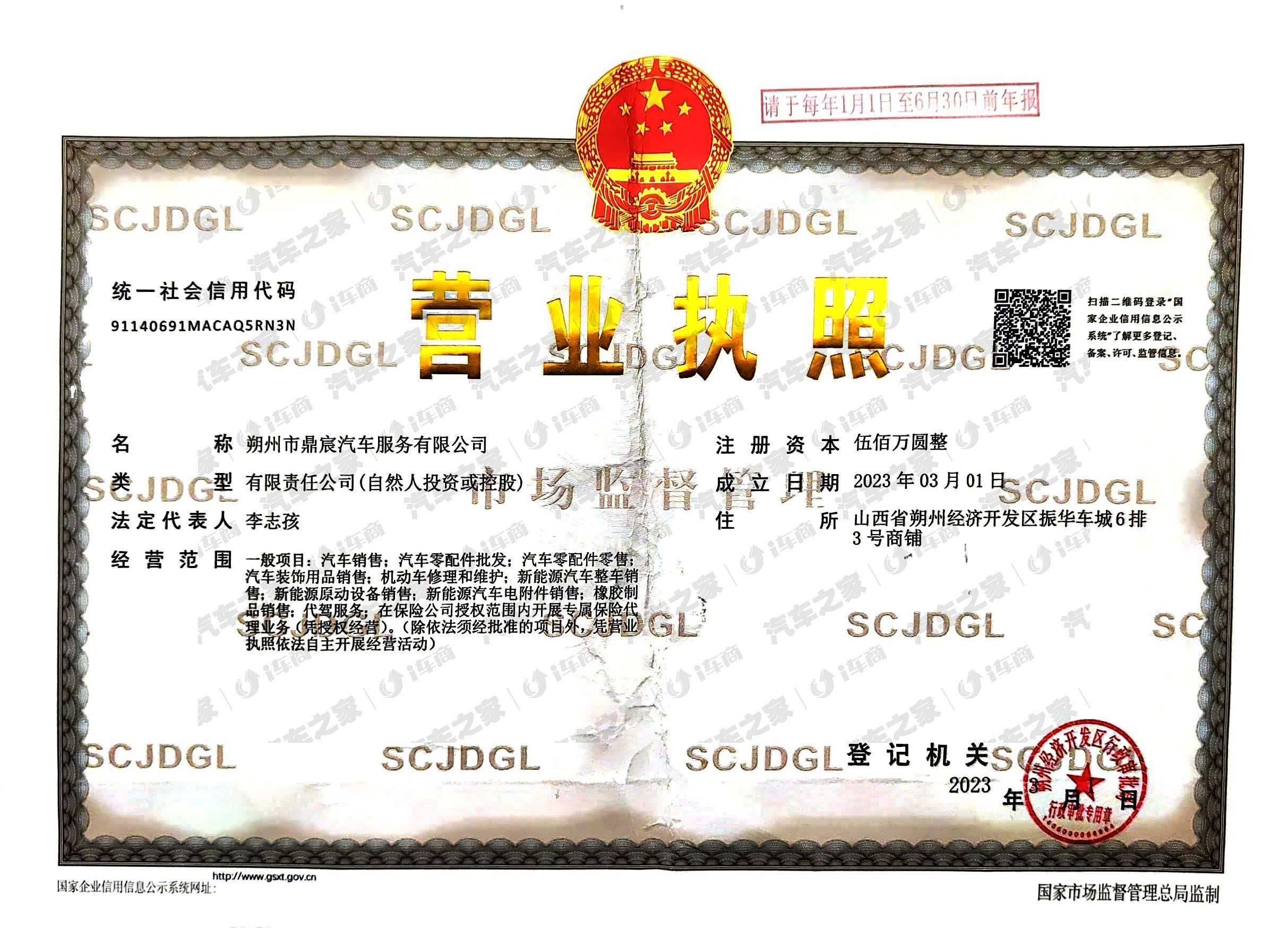 朔州市鼎宸汽车服务有限公司是一家从事汽车销售,汽车零配件批发,汽车零配件零售等业务的公司,成立于2023年03月01日,公司坐落在山西省,详细地址为:山西省朔州经济开发区振华车城6排3号商铺;经国家企业信用信息公示系统查询得知,经营范围为:一般项目:汽车销售;汽车零配件批发;汽车零配件零售,汽车装饰用品销售;机动车修理和维护;新能源汽车整车销售;新能源原动设备销售;新能源汽车电附件销售;橡胶制品销售;代驾服务;在保险公司授权范围内开展专属保险代理业务(凭授权经营);润滑油销售。