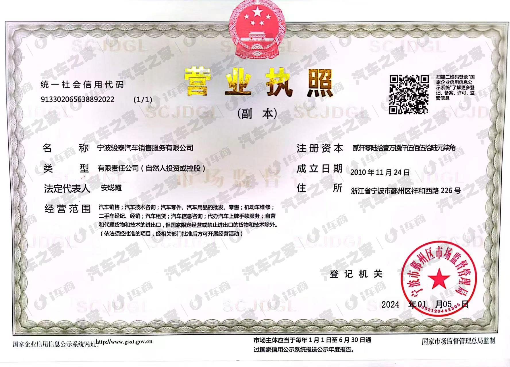 宁波骏泰汽车销售服务有限公司成立于2010年11月24日,位于浙江省宁波市鄞州区祥和西路226号。公司主要从事汽车销售、汽车技术咨询、汽车零件和汽车用品的批发零售、机动车维修、二手车经纪经销、汽车租赁、汽车信息咨询、代办汽车上牌手续服务以及自营和代理货物和技术的进出口业务公司法定代表人为安聪霞,注册资本为2061.8557万元,企业性质为有限责任公司(自然人投资或控股)。
