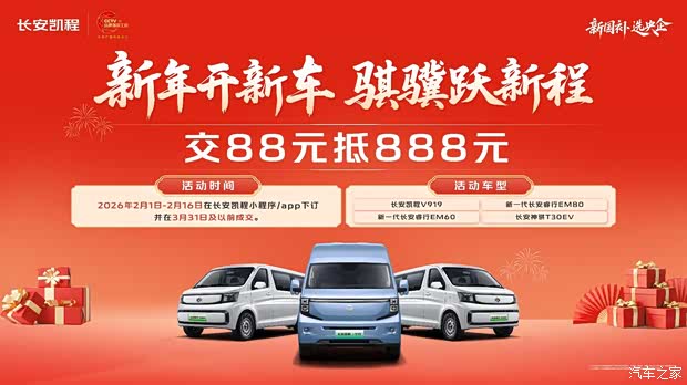 开春创富,从换辆好车开始!现在花88元锁优惠,别犹豫,赶紧登录长安凯程小程序/ APP 下订,把这份宠粉福利揣进兜里,开着新车接更多订单,今年赚得盆满钵满!