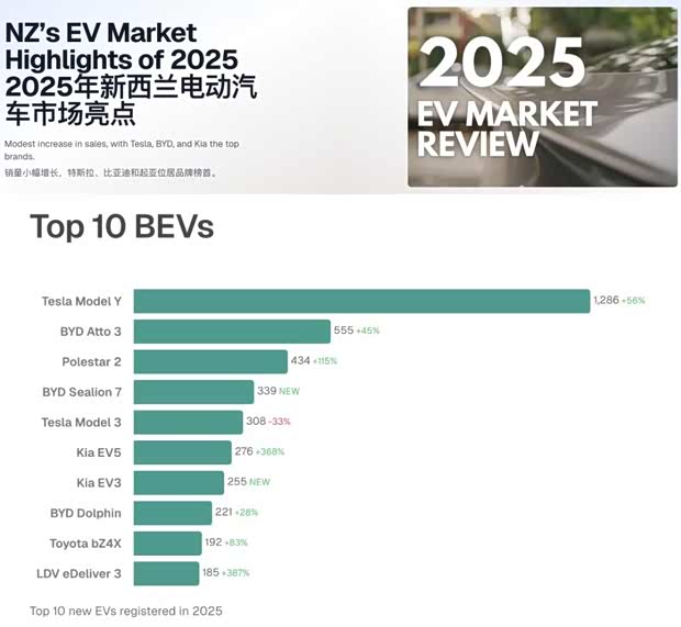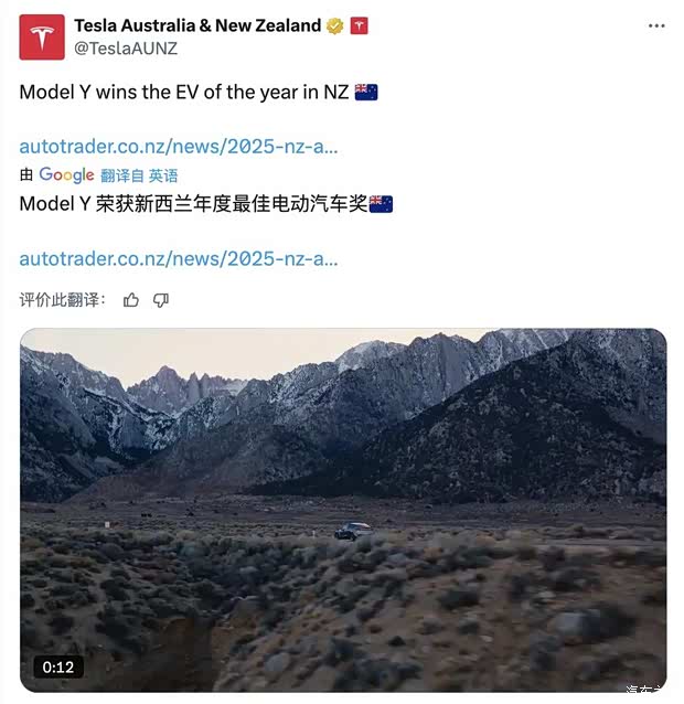 特斯拉Model Y在新西兰市场再获认可,不仅入选新西兰媒体评选的“十佳环保家用SUV”,还在此前被新西兰权威汽车杂志《NZ Autocar》评为“2025年度最佳纯电车”🏆,在设计、性能、驾控、实用性与价值等多个维度都收获了极高评价。