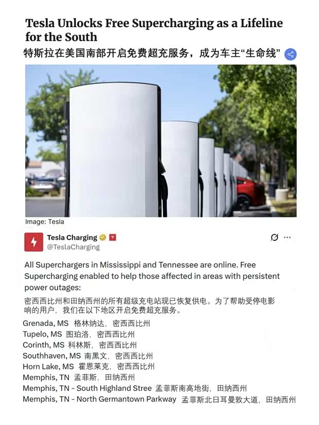 极端天气断电怎么办?特斯拉用行动给出答案:美国南部遭遇冰暴停电,数十万用户断联,特斯拉紧急开放密西西比州、田纳西州8座超充站,免费为车主充电。