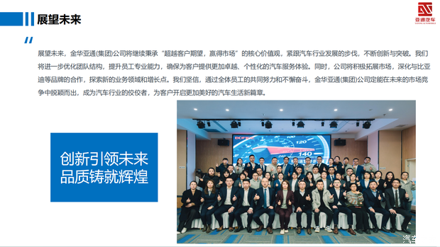 亚通汽车集团以顾客满意为核心价值观,致力于打造充满激情、富有活力、有快乐氛围的团队。在未来的发展中,集团将继续秉承初心,不断前行,以更加优质的汽车产品和服务,满足消费者日益增长的多元化需求,为更多消费者带来超越期望的购车体验和售后服务。