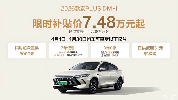 近日,秦PLUS推出超级置换+超级金融双重好礼:4月1日起至4月30日,用户购车即可享受限时超级置换补贴5000元,限时补贴价7.48万起,另叠加7年低息、3年0息等金融权益,为广大消费者带来前所未有的购车福利,助力轻松实现油转电的出行升级。